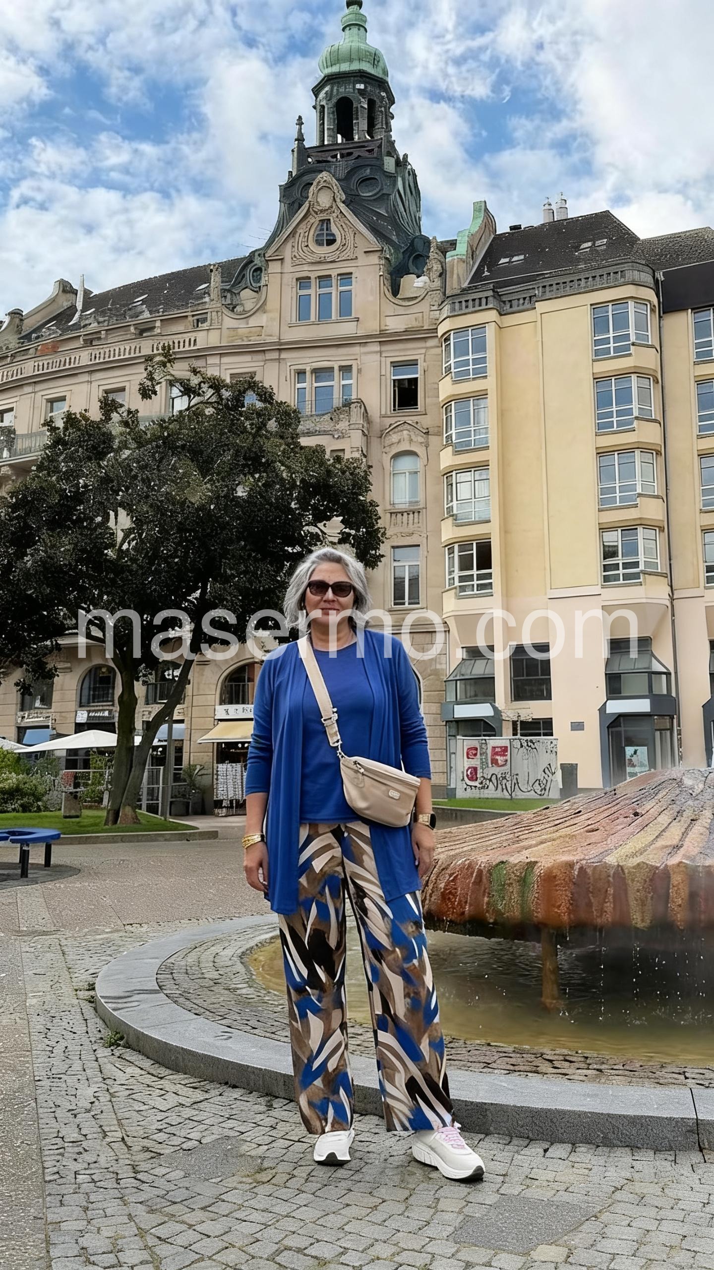 This coordinated outfit features a sleek blue cardigan over a matching top. The wide-leg palazzo pants have a bold abstract print in blue, beige, and black. Perfect for casual elegance or relaxed outings. Lightweight fabrics ensure comfort all day. Ideal for spring and summer wear.