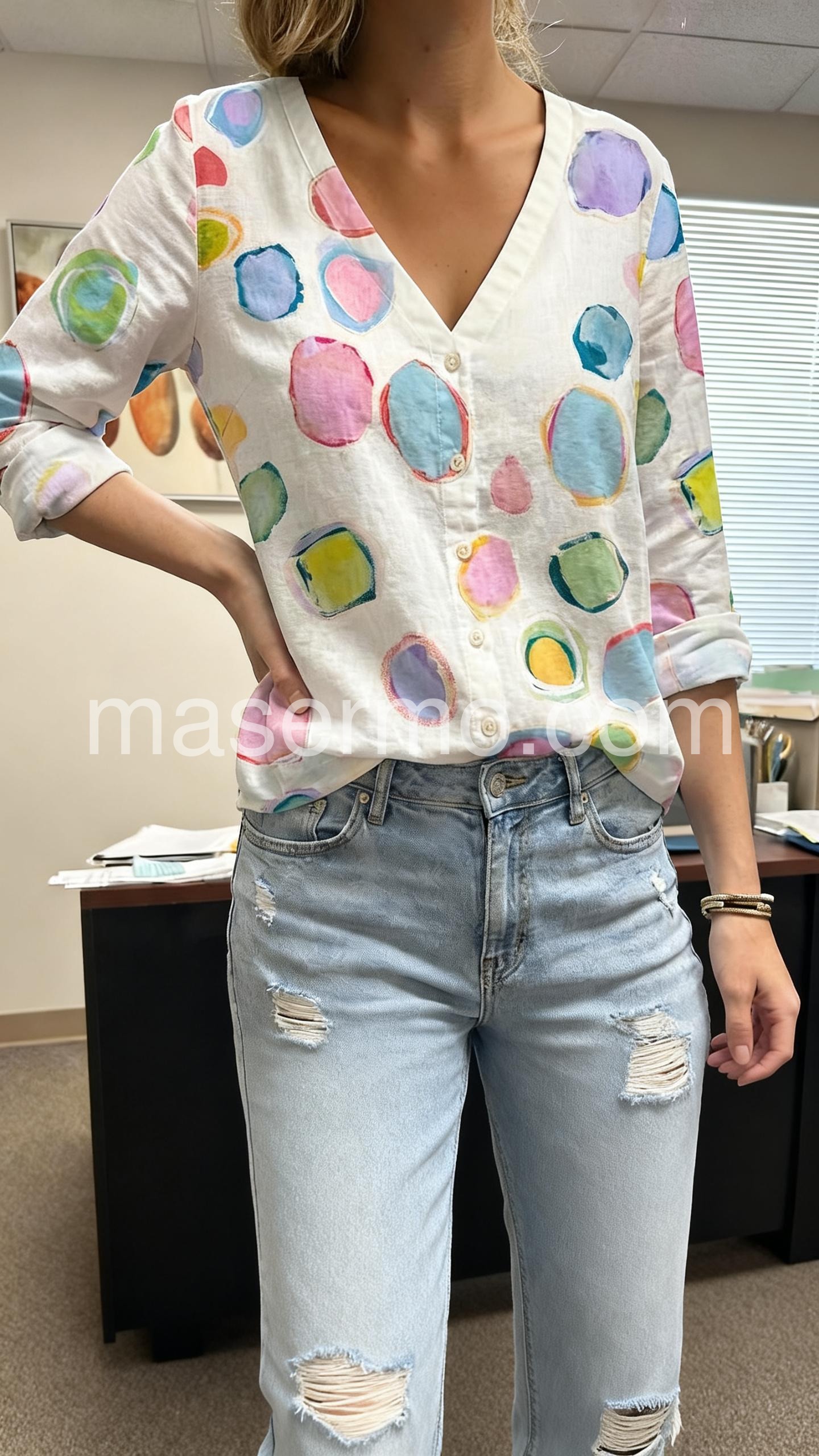 This blouse features a vibrant watercolor-style polka dot print on a soft white base. The relaxed fit and button-down front add casual charm. Rolled sleeves and side pockets enhance comfort. Perfect for pairing with jeans or shorts. Ideal for spring and summer days.