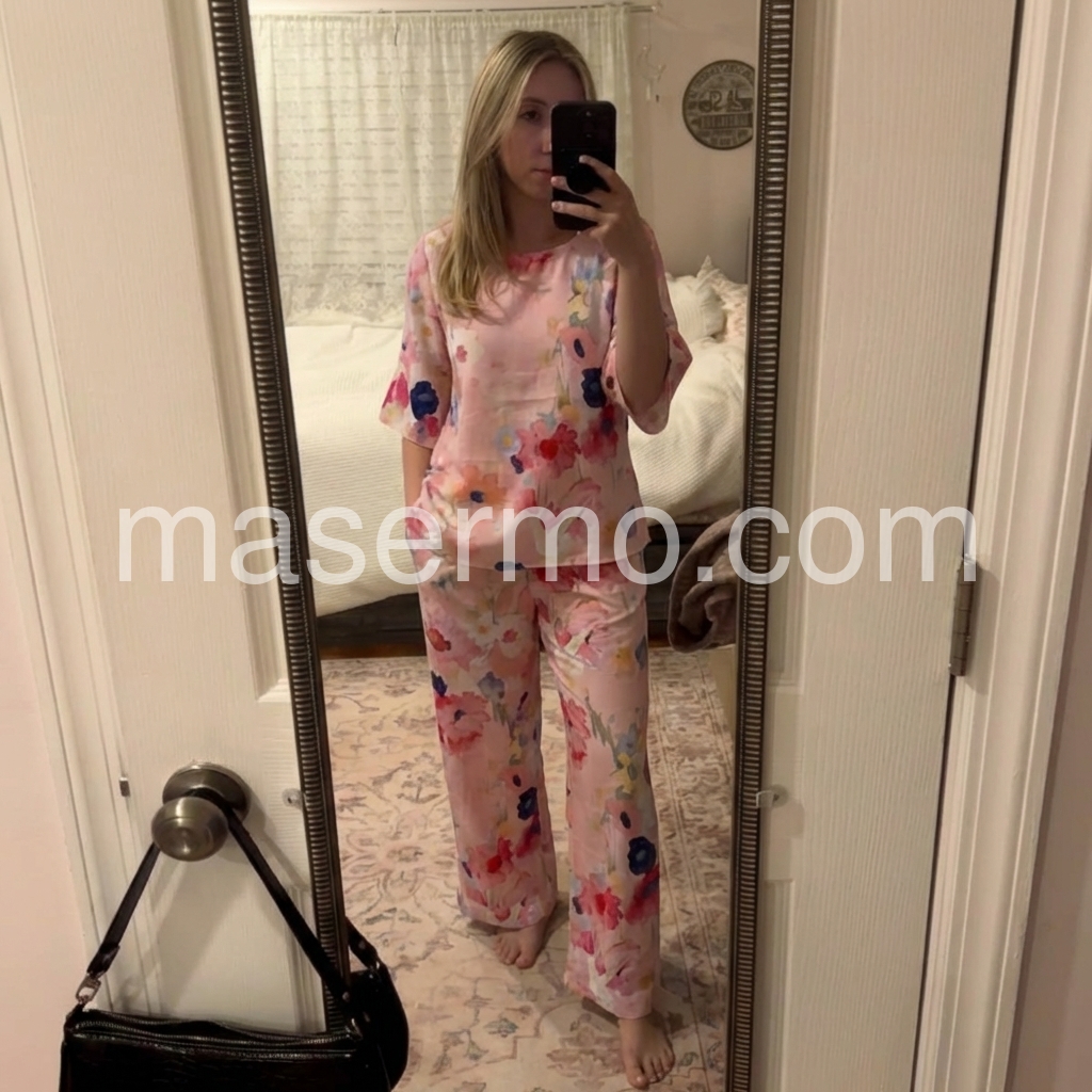 This floral two-piece set features a soft pink base with vibrant watercolor blooms in red, blue, and yellow. The relaxed-fit top has short flutter sleeves and a round neckline. Matching wide-leg pants offer comfort and ease. Perfect for casual outings or warm-weather days. Lightweight fabric ensures breathability and effortless style.