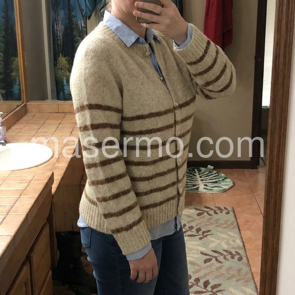 This Apricot Long Sleeve Striped Cardigan is a versatile addition to any wardrobe. Perfect for cooler days, it features a timeless striped design and long sleeves for added warmth. Made from high-quality materials, it's both comfortable and stylish, making it the perfect option for everyday wear. With its classic design and practical features, this cardigan is a must-have for any fashion-forward individual.