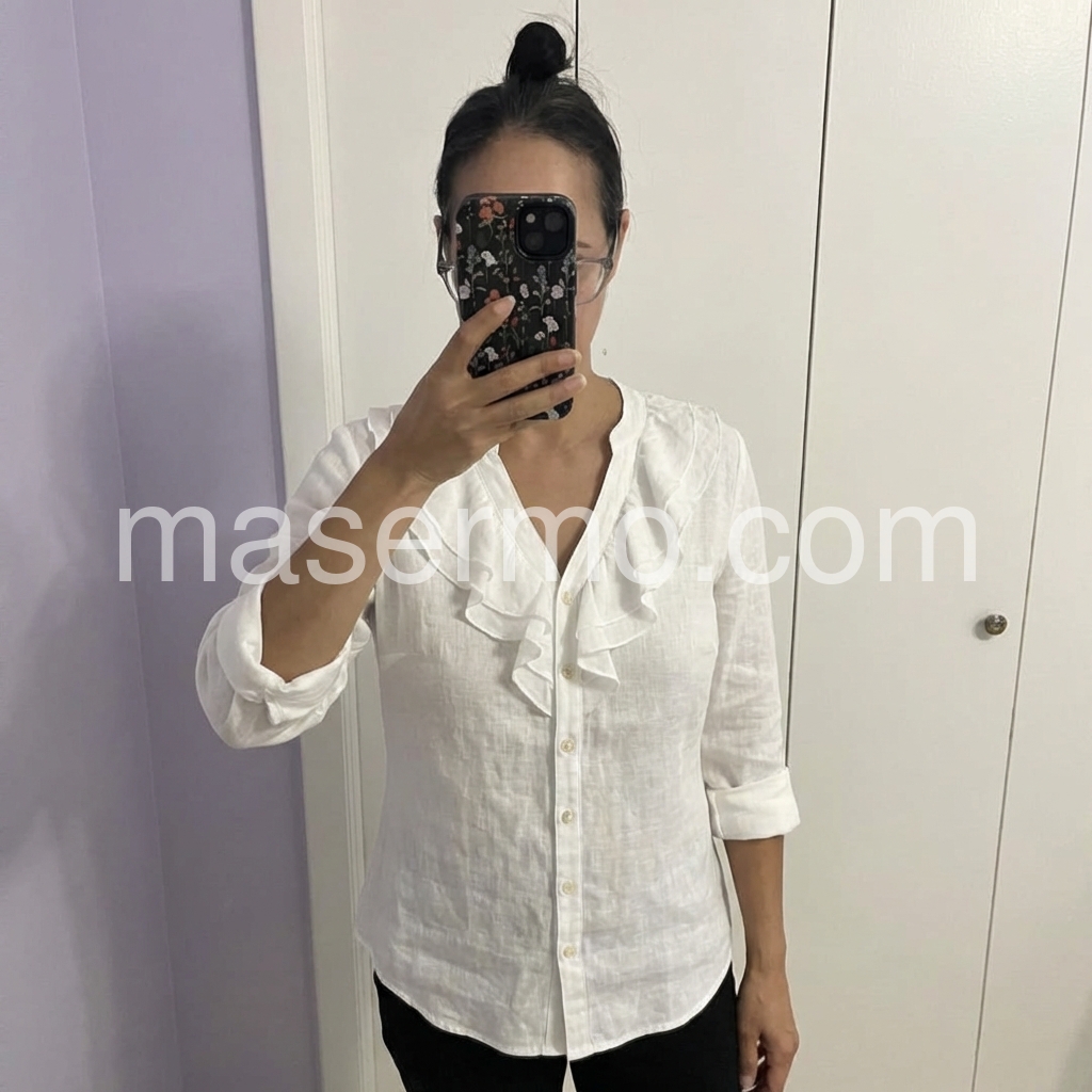 This white linen blouse features a delicate ruffled V-neckline and front button closure for a soft, romantic look. The lightweight fabric offers breathability and comfort, perfect for warm days. Rolled long sleeves add a relaxed touch, ideal for casual or semi-formal wear. Pair with jeans or tailored pants for effortless style. A timeless piece with a feminine flair.
