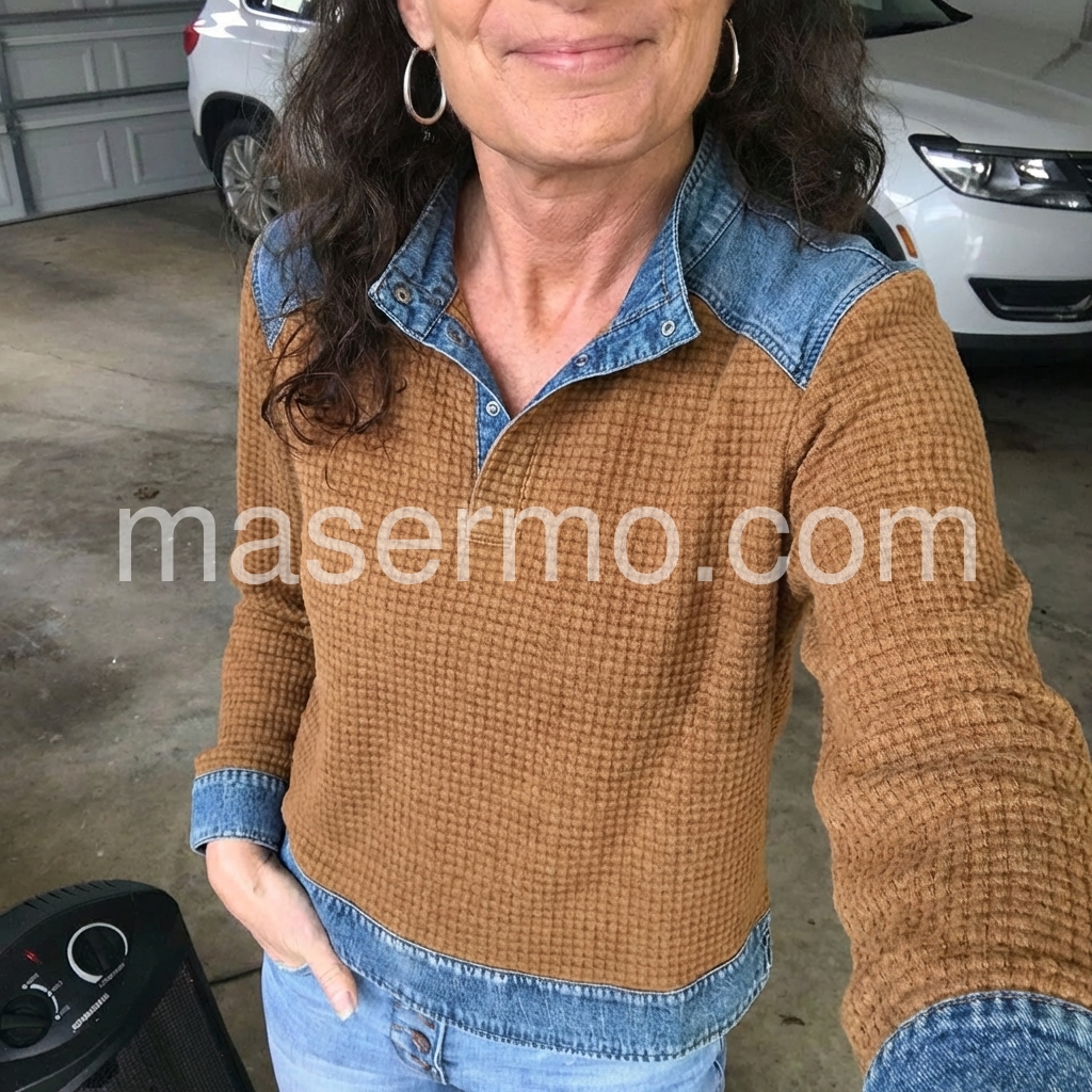 Crafted from premium denim, this long sleeve top features a sophisticated brown color block design that adds visual interest and versatility to your wardrobe. The structured fabric provides durability and maintains its shape through regular wear, while the extended sleeves offer practical coverage. The color blocking technique creates a modern silhouette that works seamlessly with both casual and elevated styling. Perfect for layering or wearing as a standalone piece, this top delivers timeless appeal with contemporary flair.