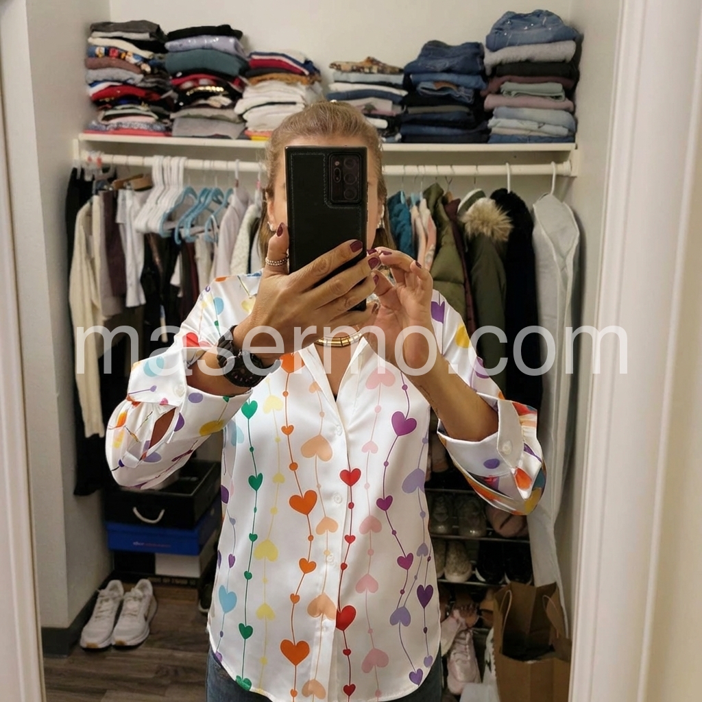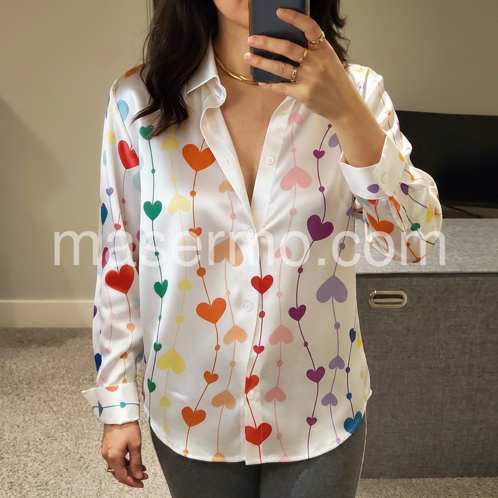 Elevate your wardrobe with this sophisticated satin blouse, featuring an enchanting heart print that adds a touch of romance to any ensemble. Crafted from luxurious satin fabric, this long-sleeve piece drapes beautifully while maintaining a polished silhouette. The smooth, lustrous finish catches light gracefully, making it ideal for both professional settings and evening occasions. Versatile enough to pair with tailored trousers or flowing skirts, this blouse seamlessly transitions from day to night. Perfect for those seeking refined elegance with a subtle hint of charm.
