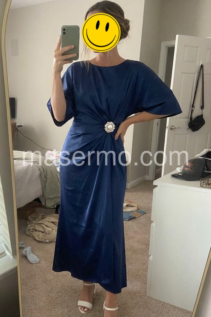 Elevate your wardrobe with this sophisticated navy satin midi dress, designed for the discerning woman who values timeless elegance. The flowing cape sleeves add a dramatic yet refined silhouette, while the luxurious satin fabric drapes beautifully against the body. Perfect for evening events, formal occasions, or elevated everyday wear, this versatile piece transitions seamlessly from day to night. The midi length offers a modern take on classic sophistication, providing both coverage and movement. A wardrobe essential that combines understated luxury with contemporary design.