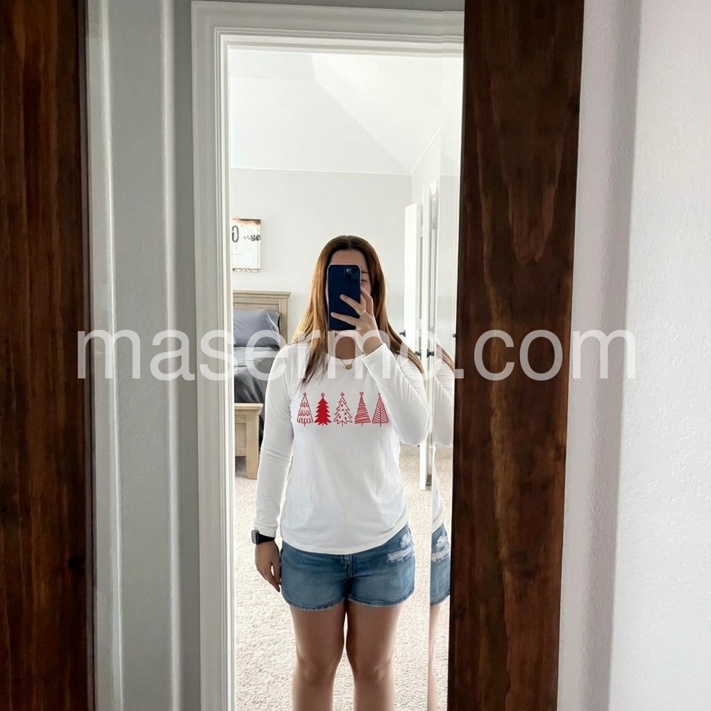 Celebrate the holidays in chic style with this casual Christmas top. A round collar and long sleeves with a waist-length fit make it perfect for layering with a cami underneath and your favorite jacket. A row of cute red Christmas trees gives it just enough holiday cheer, making it versatile enough to wear to work, out, or casually.