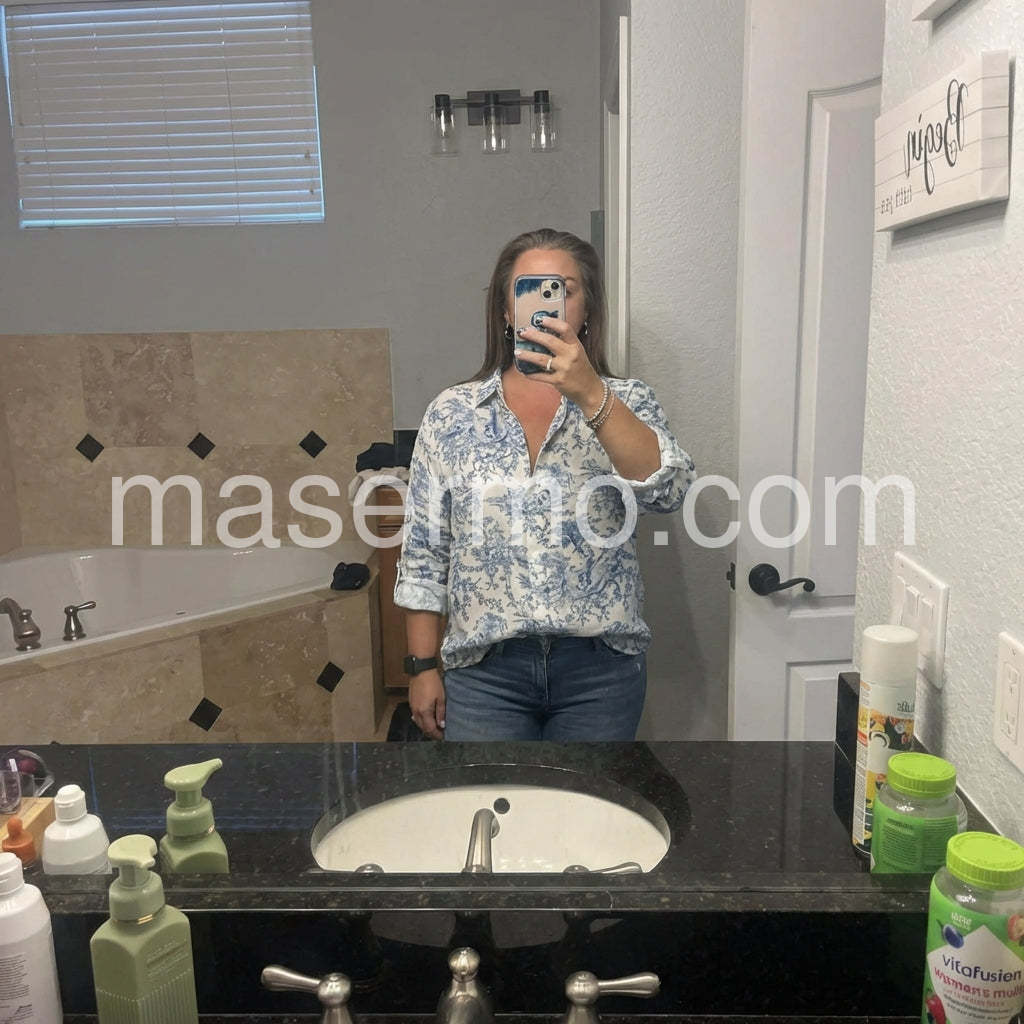 Elevate your wardrobe with this Romantic Blue Floral Print Button Down Shirt, a refined piece that blends vintage charm with modern sophistication. Crafted from lightweight, breathable cotton or cotton-blend fabric, this long-sleeve shirt features an elegant toile de Jouy print—featuring delicate blue pastoral scenes of trees, figures, and floral motifs on a crisp white background—inspired by traditional French design. The clean collar and full button-down front offer a polished look, while the slightly relaxed fit ensures comfort and ease. Roll up the sleeves for a casual, lived-in vibe or keep them down for a more tailored appearance. Perfectly paired with jeans, denim shorts, or high-waisted trousers, it’s ideal for brunch dates, weekend outings, or office-to-evening transitions. Inspired by the curated, effortlessly chic styles found on Lulus.com, this blouse brings timeless elegance to any outfit. A must-have for those who love classic patterns, subtle romance, and wearable artistry. Let this shirt carry you through spring and summer with grace, style, and a touch of old-world charm.
