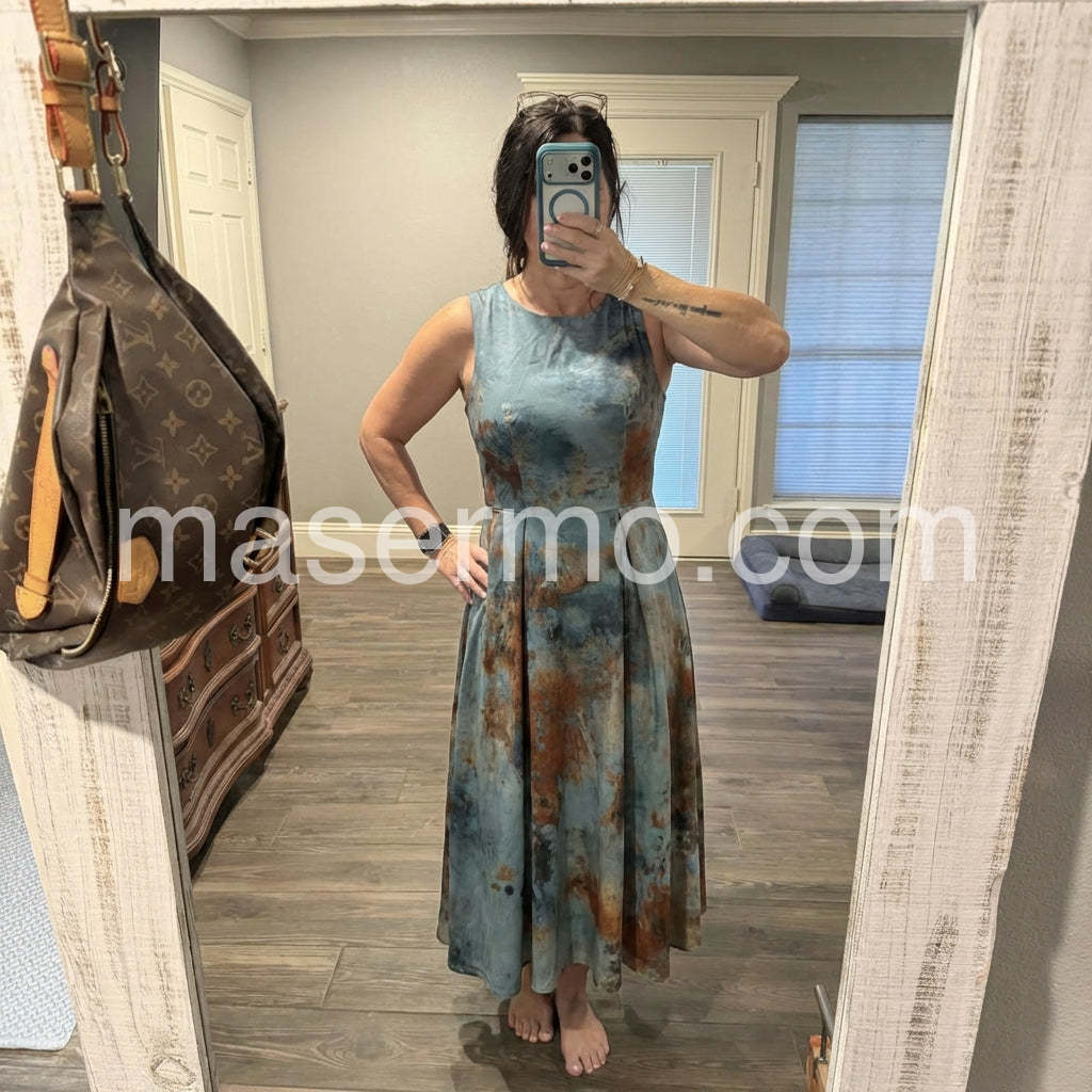 This stunning sleeveless midi dress features a bold abstract print with a harmonious blend of soft blue, earthy rust, and muted gold tones, reminiscent of a watercolor masterpiece. Crafted from luxurious, structured fabric, the dress boasts a flattering high-neck design and a tailored fit through the bodice that elegantly flares into an A-line skirt, creating a graceful silhouette. The mid-calf length adds timeless sophistication, making it perfect for cocktail parties, weddings, or upscale evening events. Paired with delicate heels and a sleek clutch, this dress exudes refined elegance and artistic flair—ideal for those who appreciate fashion with a touch of modern artistry.