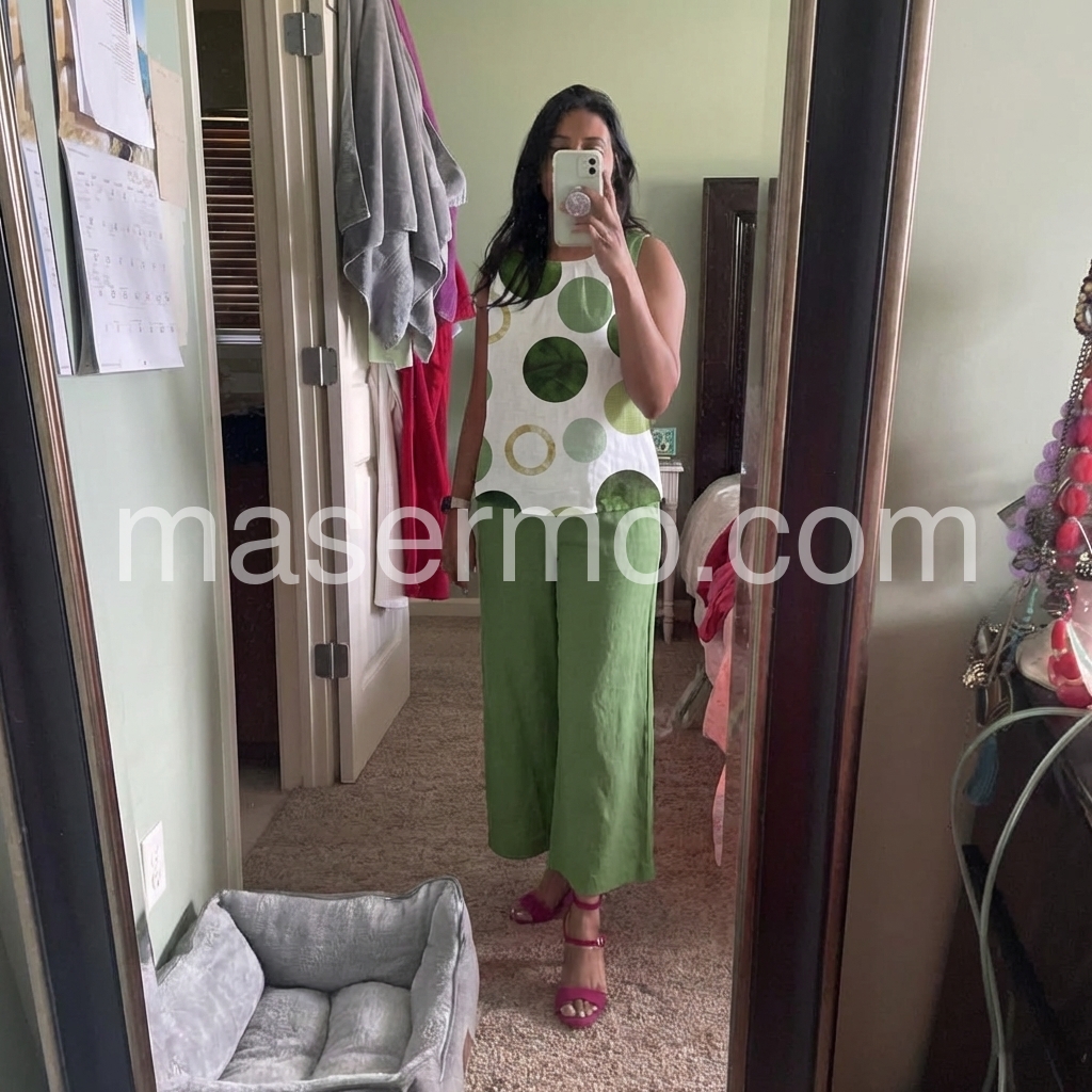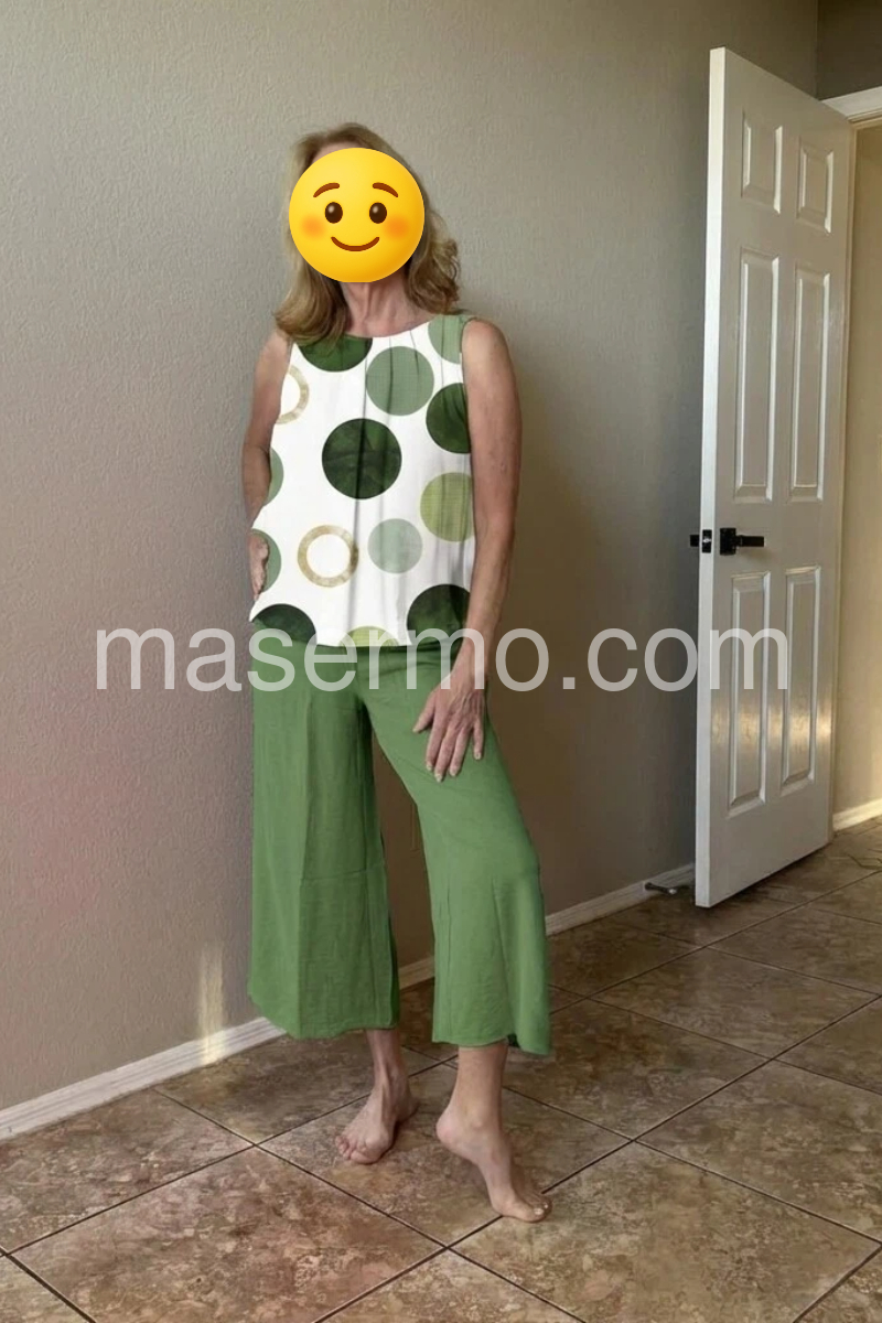 This coordinated set features a sleeveless top with bold green polka dots on a white background. Paired with solid olive-green wide-leg pants for a clean, contemporary look. Lightweight and comfortable fabric ideal for everyday wear. Perfect for casual outings or relaxed summer days. Stylish and easy to style.