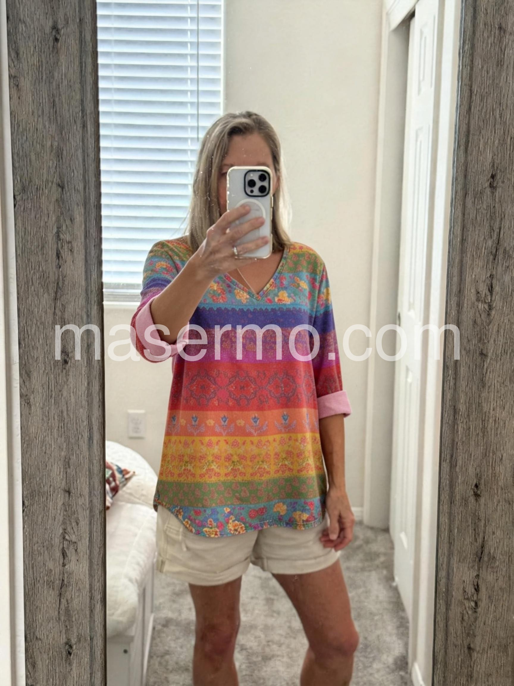 Step into a world of color and culture with this Vibrant Boho Print Multicolor Top, a bold and artistic piece that celebrates global inspiration with every stitch. Crafted from soft, lightweight fabric—likely cotton or rayon blend—this tunic features a stunning horizontal stripe pattern in rich hues of purple, magenta, orange, yellow, teal, and green, each adorned with intricate floral and tribal motifs reminiscent of traditional Mexican or South Asian textiles. The deep V-neckline adds a touch of elegance and femininity, while the relaxed, oversized silhouette drapes beautifully for ultimate comfort. Three-quarter sleeves with rolled cuffs enhance its laid-back charm, making it perfect for pairing with jeans, leggings, or flowy pants.