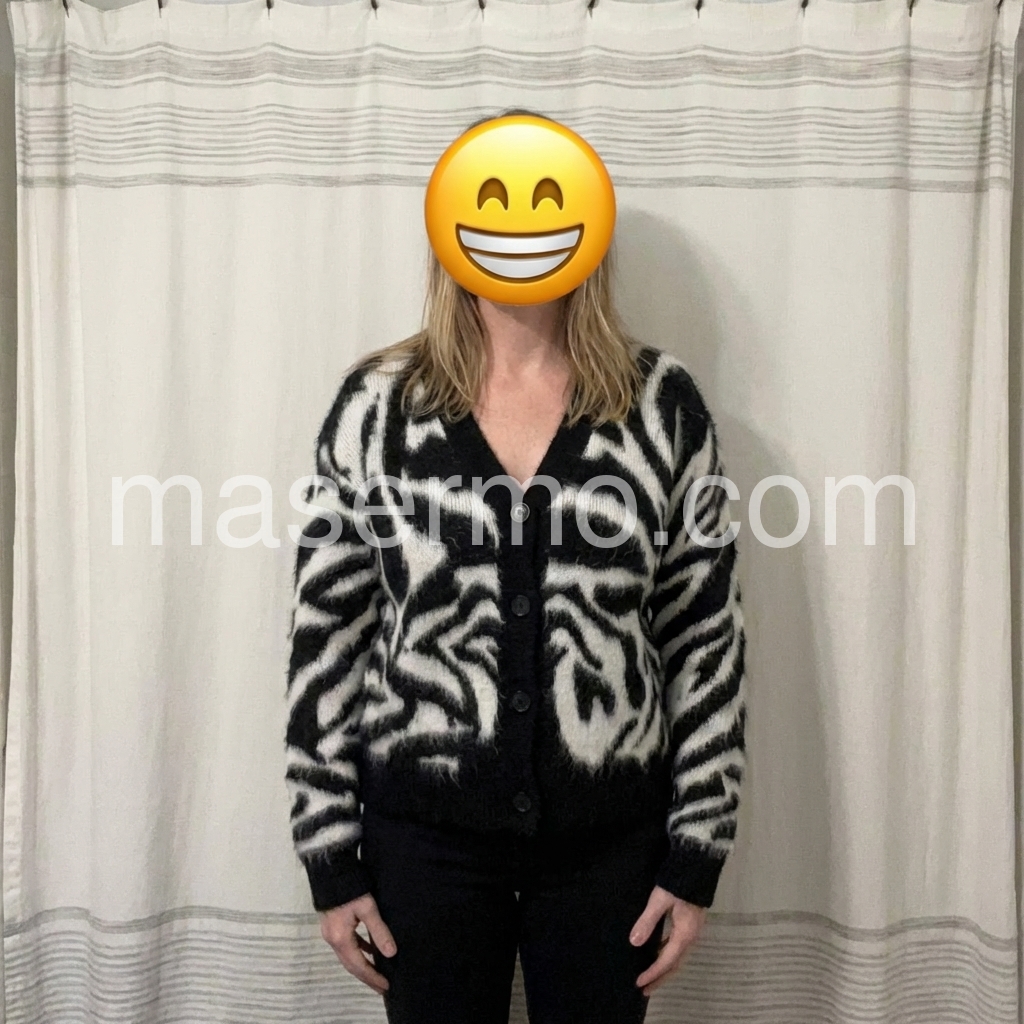Elevate your wardrobe with this bold zebra-print knit cardigan crafted from a luxurious soft mohair blend. Its distinctive pattern adds a striking visual contrast, while the mohair fibers ensure lightweight warmth and a plush texture. Designed for both style and comfort, this cardigan is ideal for layering during transitional seasons, providing a sophisticated yet edgy statement piece to your collection.