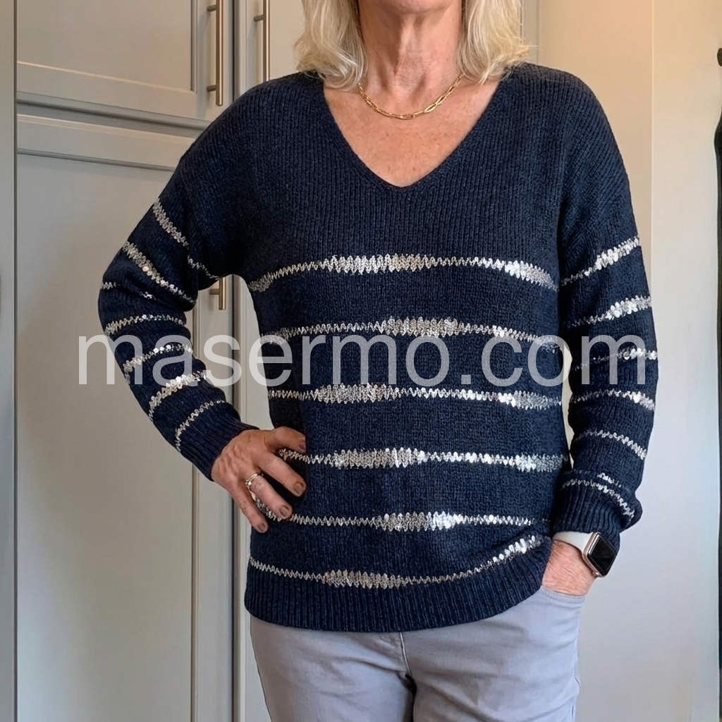 Stay stylish and warm with our Groovy V-Neck Striped Print Navy Sweater. The v-neck adds a touch of elegance while the striped print adds a trendy flair. Made with high-quality materials, this sweater is perfect for any occasion. Upgrade your wardrobe and stay cozy this season.