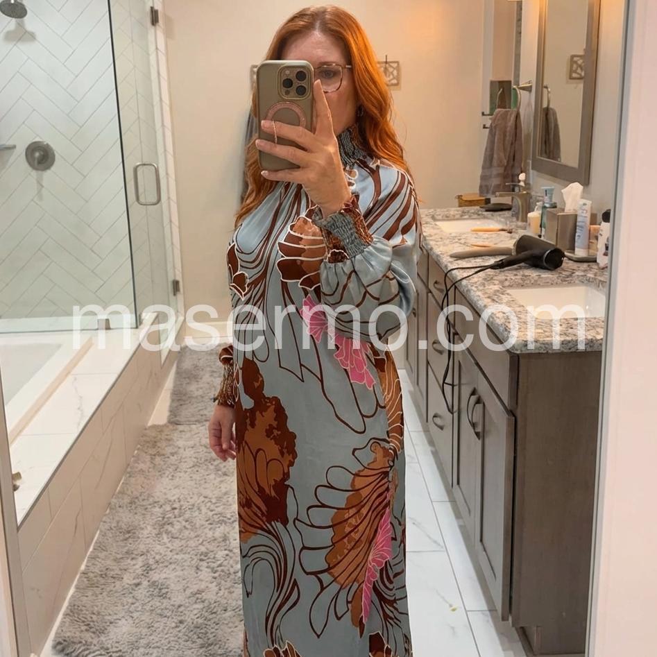 As a product expert, I present to you this Popular Long Sleeve Print Maxi Dress. Made of lightweight, breathable fabric, this dress is perfect for any occasion. With its elegant long sleeves and flattering print design, you'll feel confident and stylish all day long.