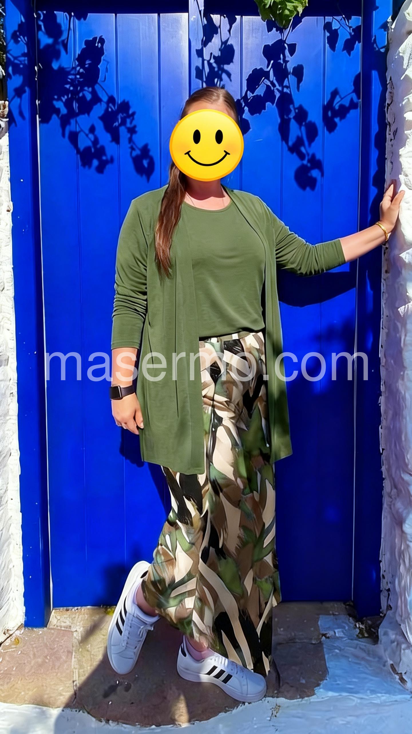 This three-piece set features a solid green top, matching open-front cardigan, and wide-leg pants with a bold tropical leaf print. The relaxed silhouette offers comfort and style. Perfect for casual outings or warm-weather wear. Lightweight fabric ideal for everyday elegance. Effortlessly chic and easy to wear.