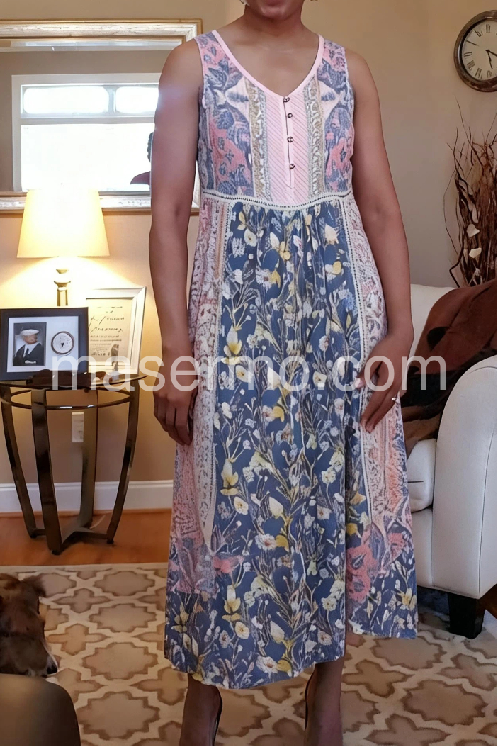 This sleeveless midi dress features a vibrant blue floral print with delicate embroidery details. The V-neck and button-down front add a touch of charm. Lightweight fabric perfect for summer days. Ideal for beach outings or casual events. Effortlessly stylish with a bohemian flair.