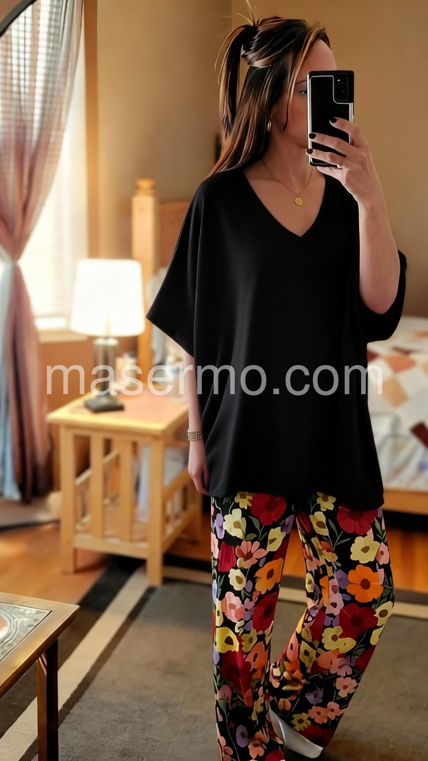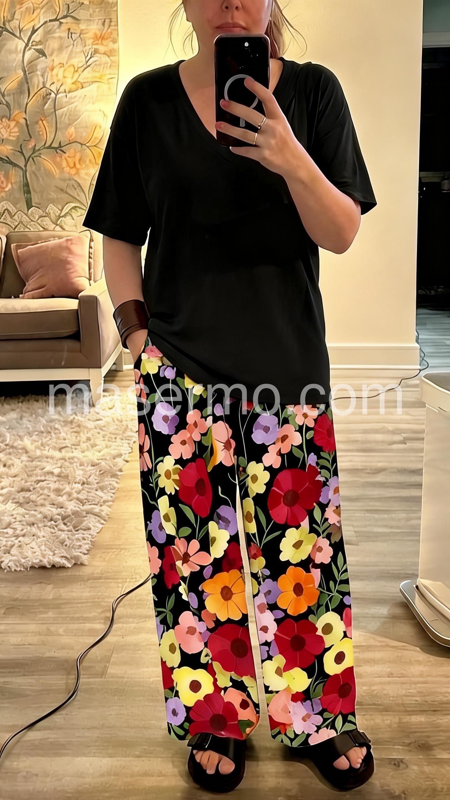 This coordinated set features a loose-fitting black V-neck top and wide-leg pants with colorful floral prints. The contrast creates a lively, eye-catching look. Lightweight fabric perfect for warm days. Ideal for casual outings or relaxed summer wear. Comfortable and effortlessly stylish.
