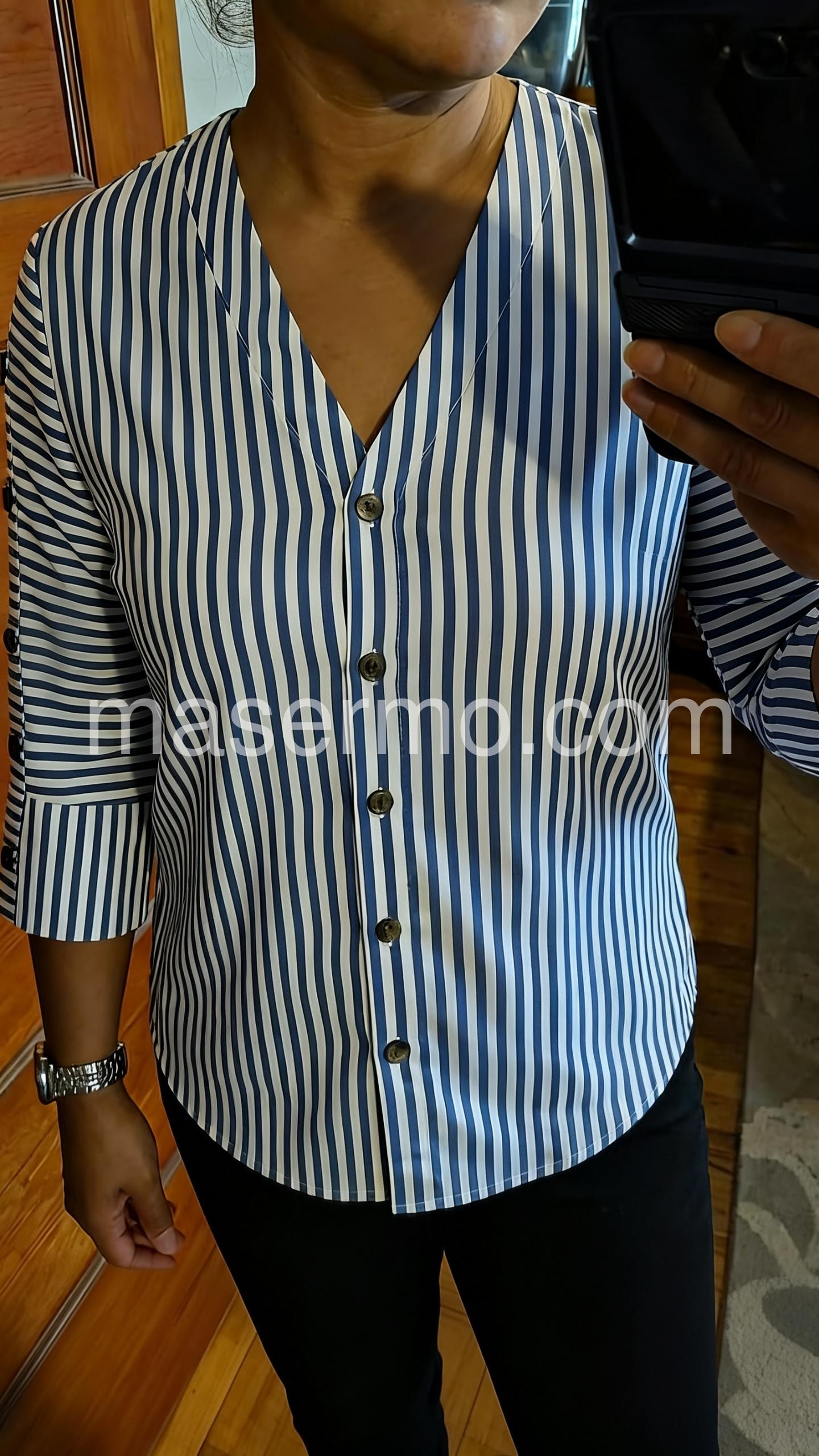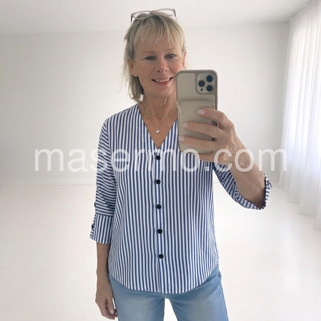 Effortless elegance meets everyday versatility in this timeless striped blouse. The flattering V-neckline draws the eye upward, while crisp vertical blue and white stripes create a refined, elongating silhouette. Crafted from a breathable cotton-elastane blend, the three-quarter sleeves feature charming side button details that elevate the design beyond the ordinary. Slip it on for weekend brunch, office meetings, or casual dinners—this piece transitions seamlessly across your week. The lightweight fabric moves with you, never constraining, always comfortable. Pair with tailored trousers for polished sophistication or your favorite jeans for relaxed chic. This is the blouse you'll reach for again and again. Make it yours today.