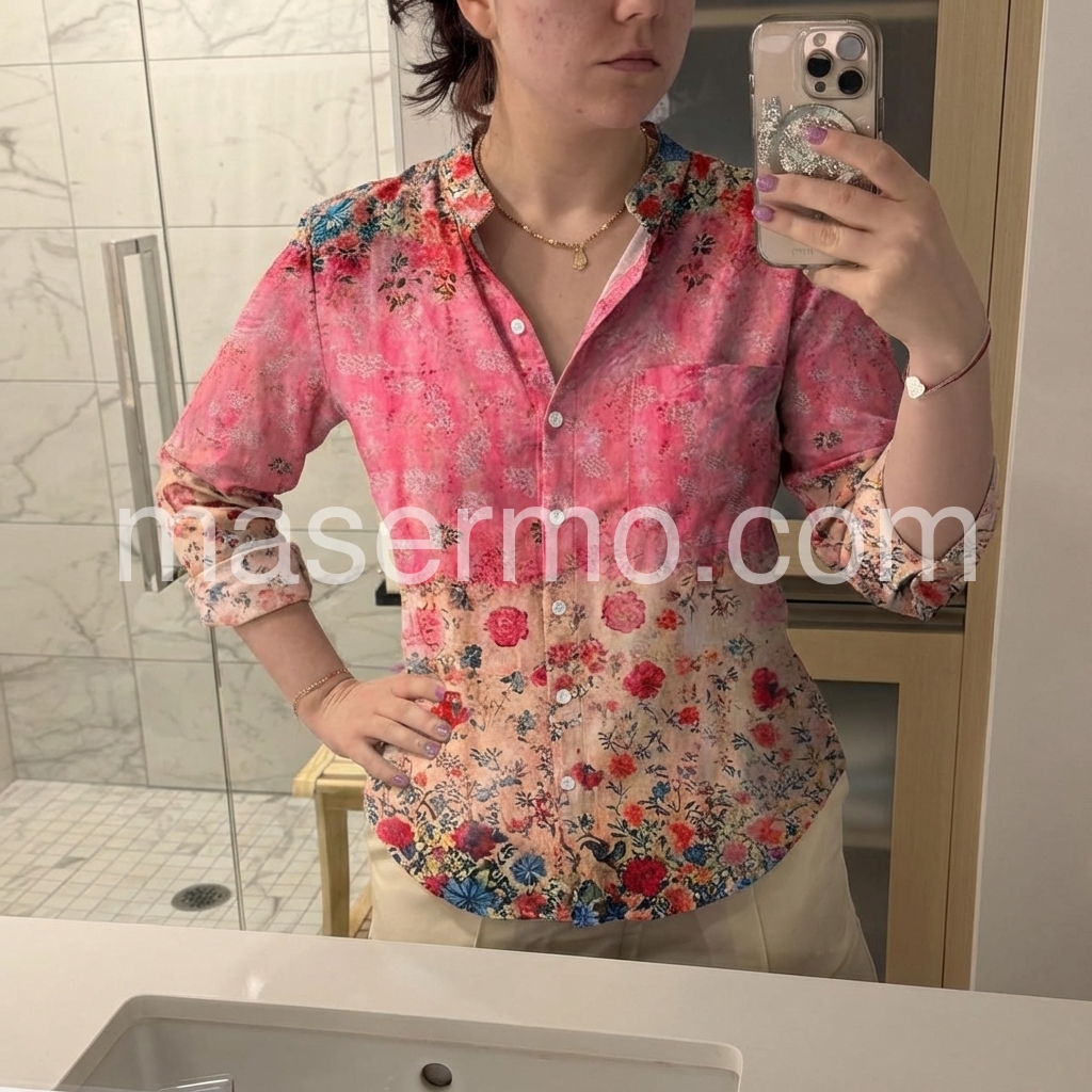 This floral blouse features a beautiful ombre effect, transitioning from bold pink to soft peach with vibrant floral prints. The classic button-down design includes a chest pocket and long sleeves with rolled cuffs. Made from lightweight, breathable fabric for comfort. Perfect for casual days or spring outings. Pair with jeans or trousers for a chic look.