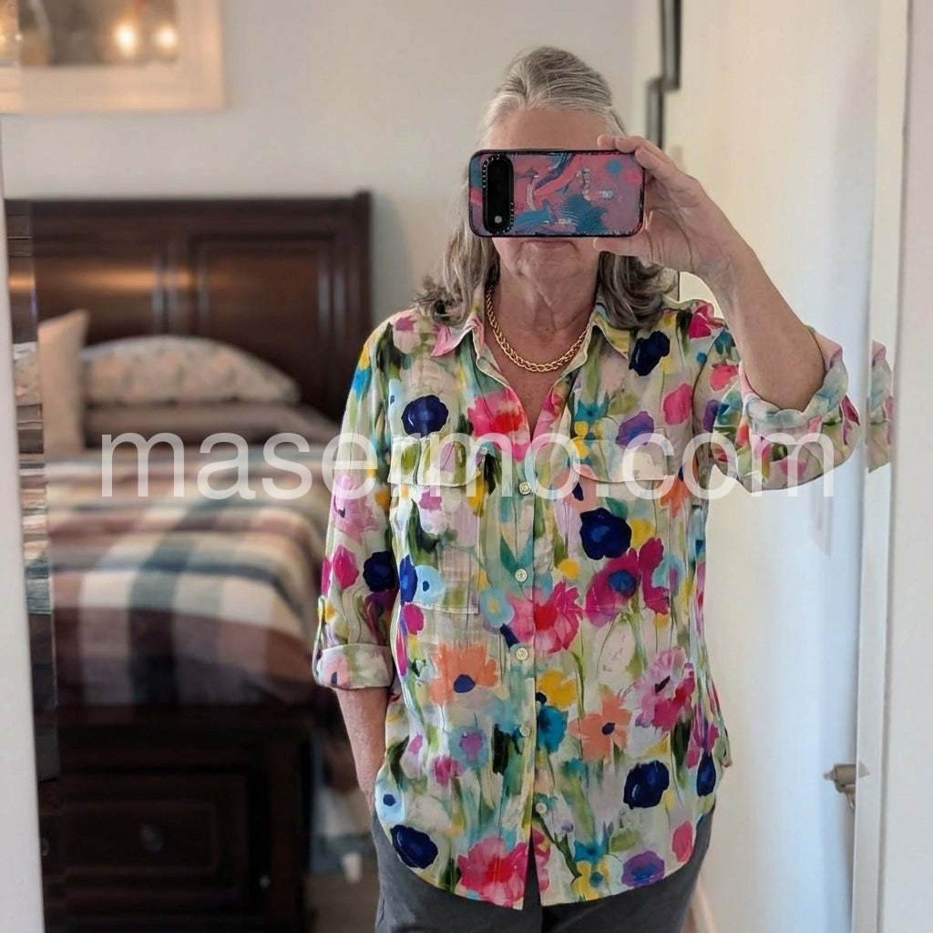 Make a statement in this Vibrant Watercolor Floral Shirt, a lively and artistic blouse that brings bold color and expressive flair to your wardrobe. Crafted from lightweight, fluid fabric—likely silk or satin blend—this long-sleeve button-up features a dynamic watercolor-inspired floral print in rich shades of pink, fuchsia, cobalt blue, emerald green, and sunny yellow, creating a painterly effect that feels both modern and romantic. The classic shirt silhouette includes a collared neckline, front button closure, and two chest pockets that add structure and charm. Rolled sleeves offer a relaxed, effortless look perfect for warm-weather days. Paired here with a shimmering sequin skirt and gold accessories, it effortlessly blends boho elegance with glamor. Ideal for summer outings, beachside dinners, or festive occasions, this floral blouse adds energy, personality, and a touch of artistic flair to any outfit. Let its vibrant hues and fluid design turn heads wherever you go.