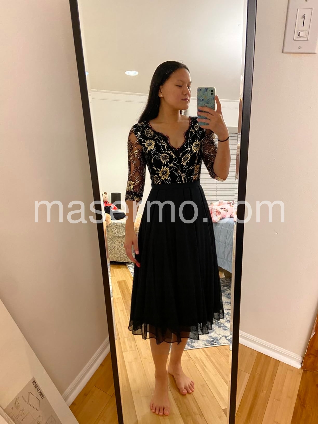This stylish midi dress features a flattering V-neck design and elegant 3/4 sleeves, making it perfect for any occasion. With its versatile and timeless style, it offers a comfortable and chic look that can be dressed up or down. Made from high-quality materials, this dress is a must-have for any fashion-forward wardrobe.